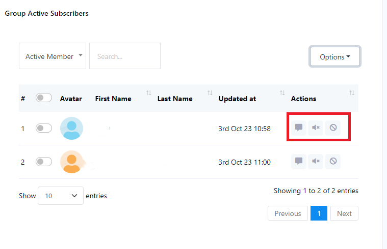Following that, you`ll find a list of your group members. You can customize the number of members displayed using the `Show Entries` option and navigate through the list using the previous and next page buttons.