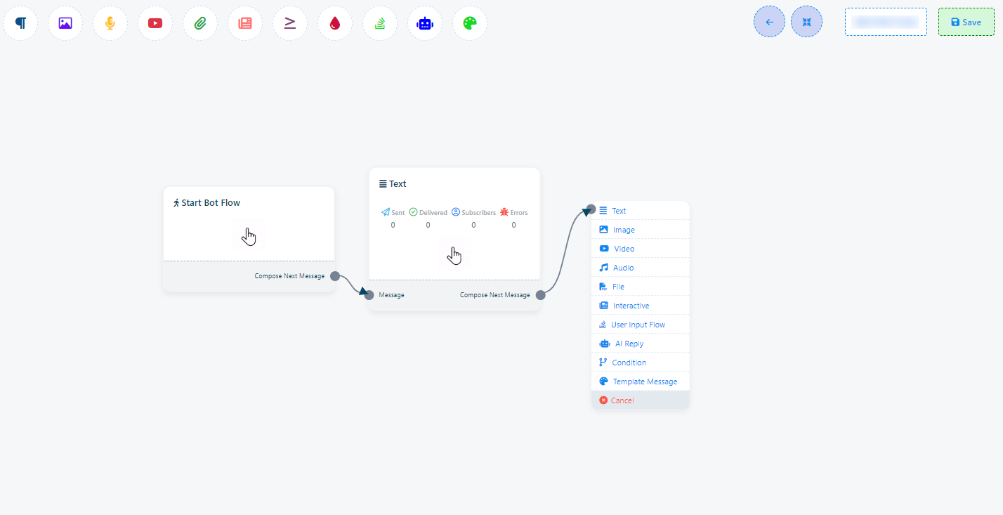16. Once you`ve completed the `Start Bot Flow` setup, you`ll encounter a sockets: `Compose Next Message`, These sockets allow you to add various components and configure them.
